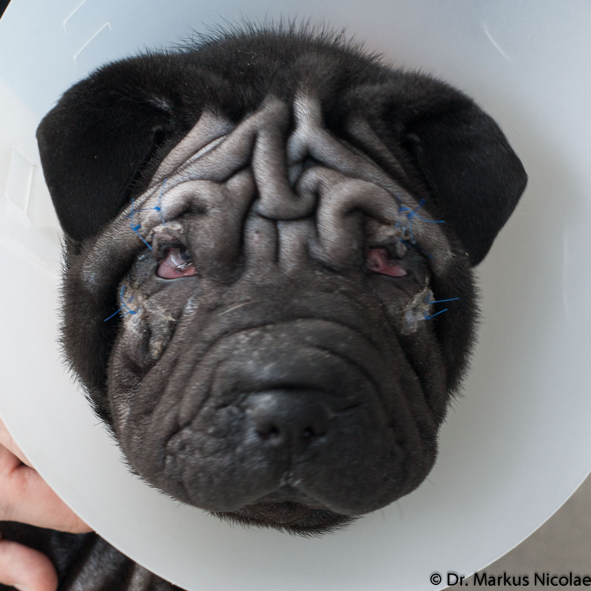 Chinesischer Faltenhund: exzessive Hautfalten verhindern das Öffnen der Augen, hier mit einigen Halteheften, damit der Blick