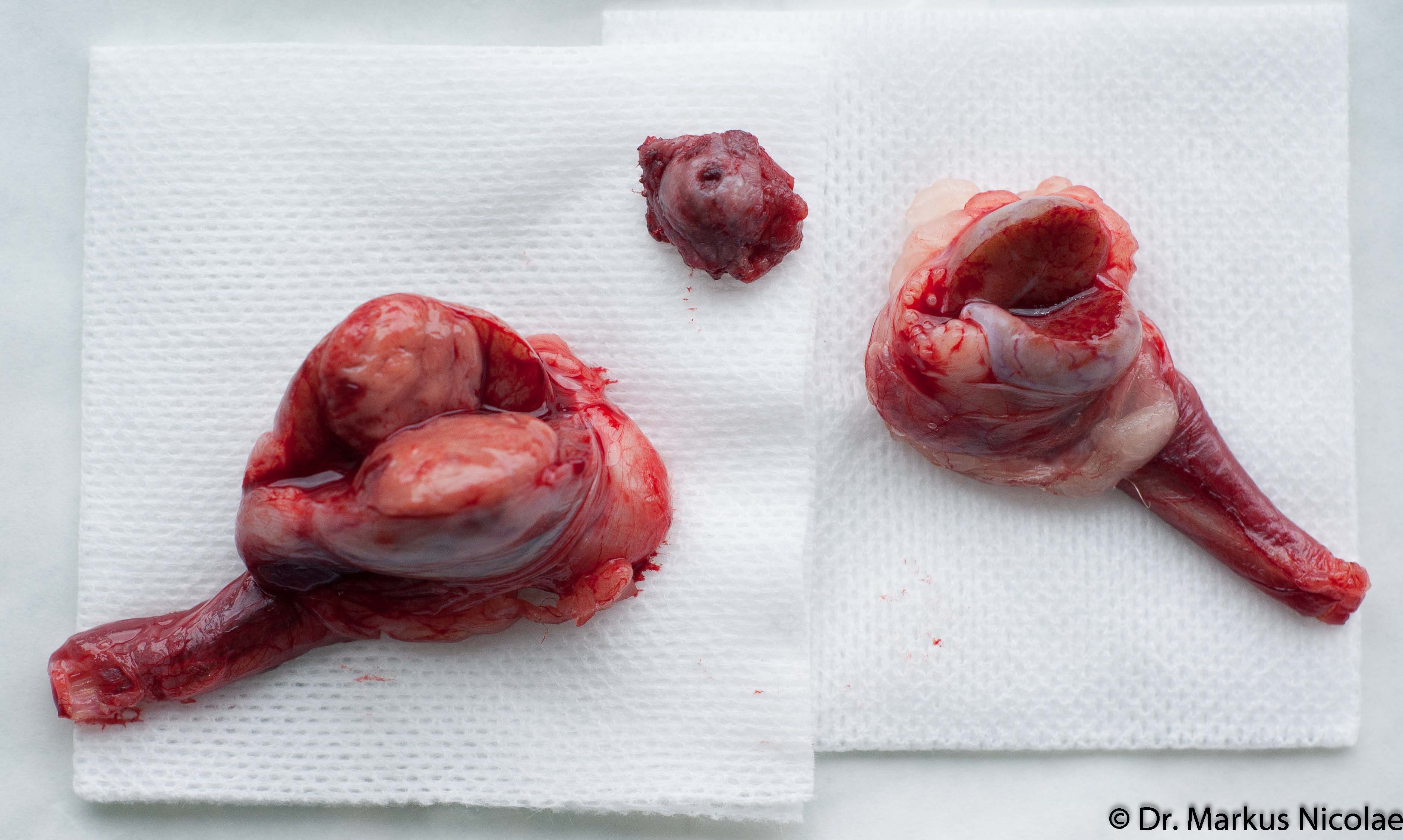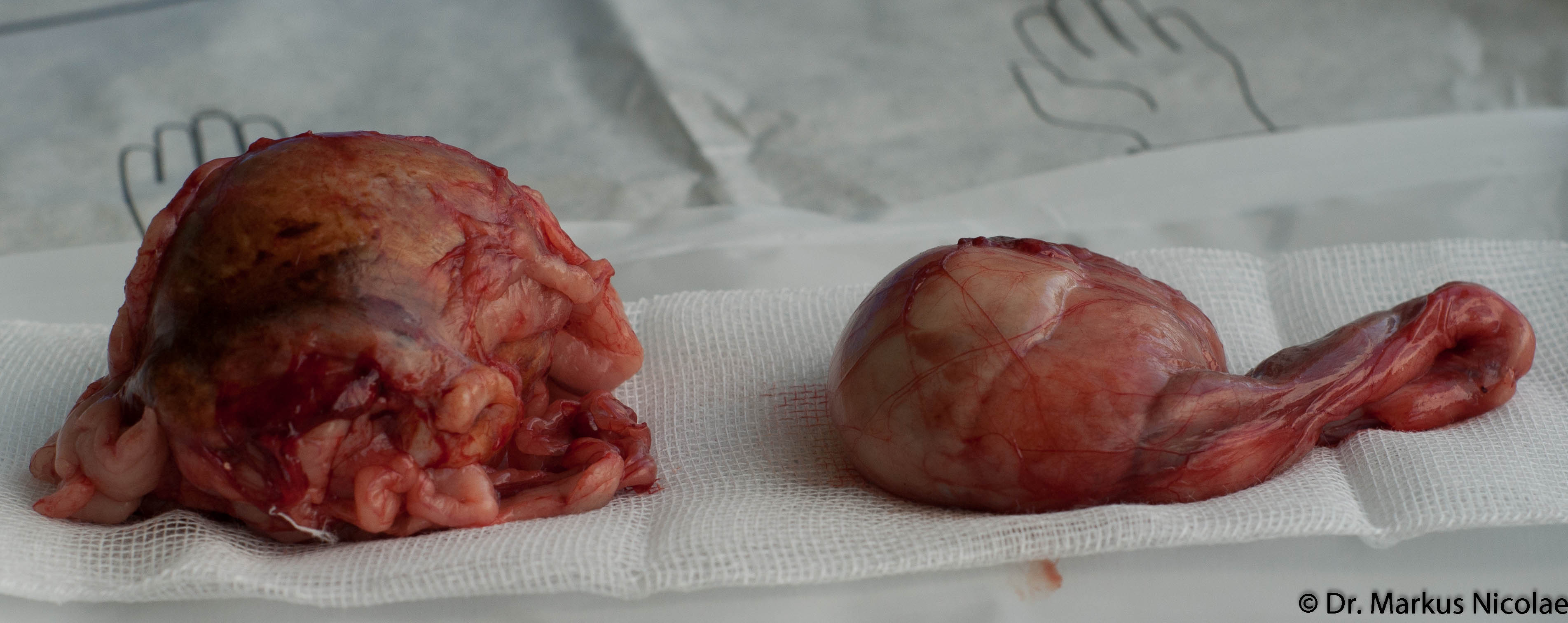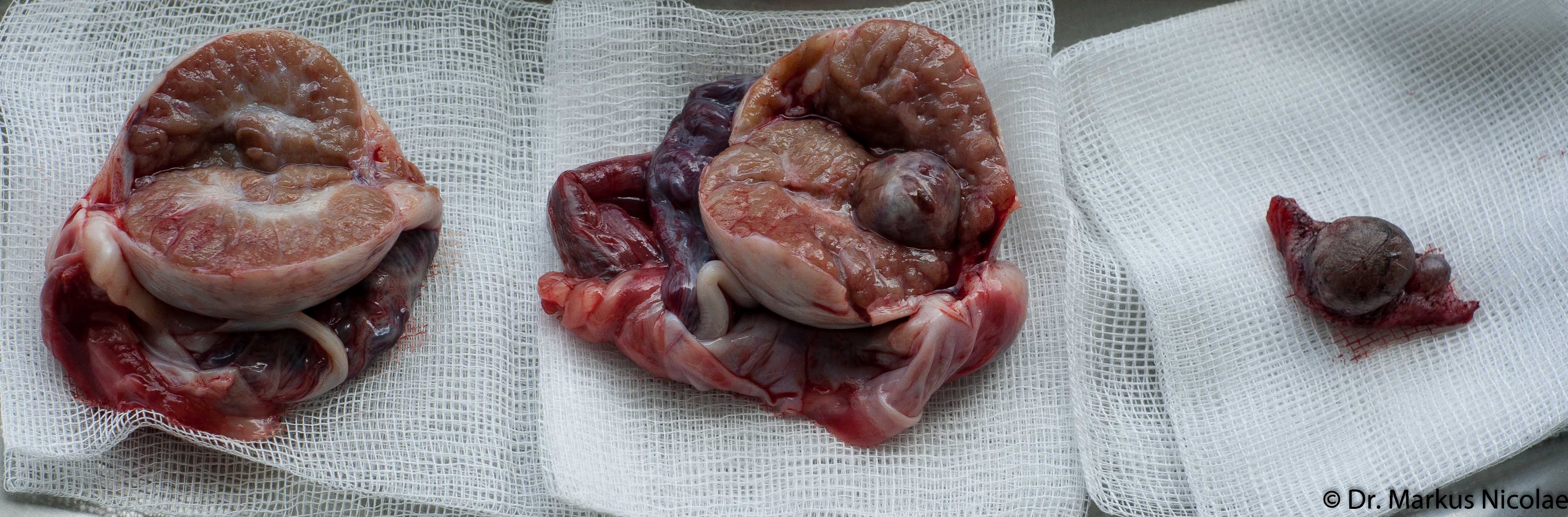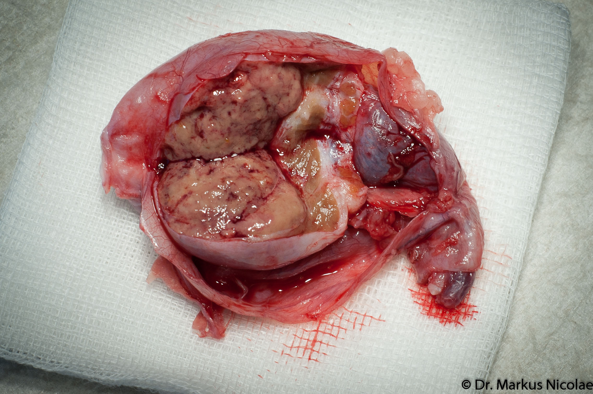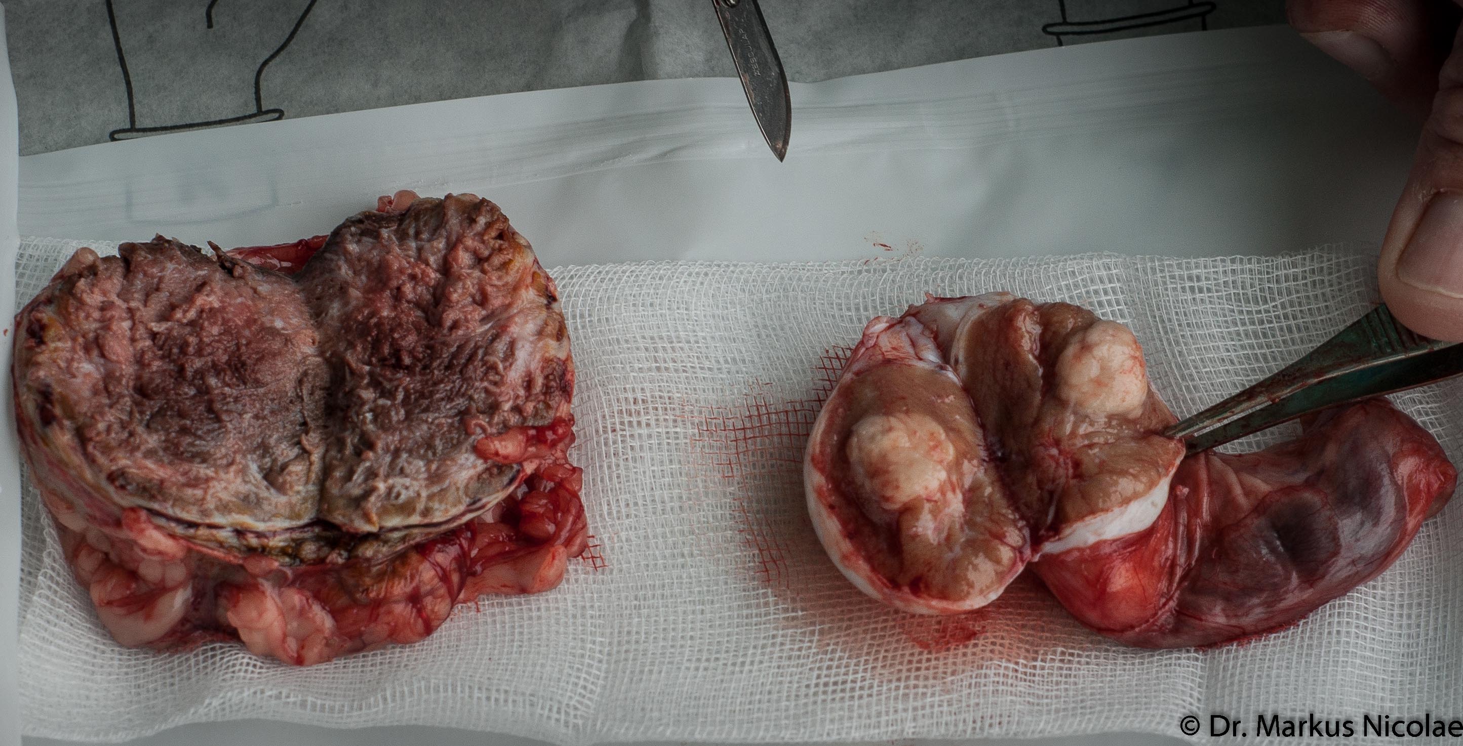 Bild 3: Dieselben Hoden im Anschnitt. Der linke, größere, ist vollständig entartet und selbst im